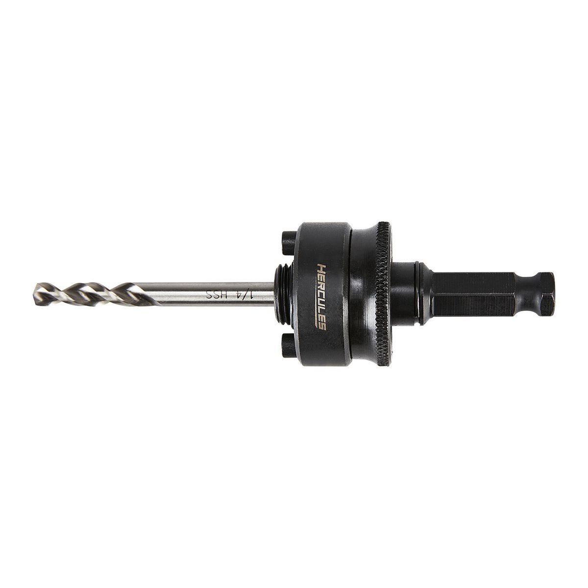 The HERCULES™ Hole Saw Arbor makes quick and easy changes with HERCULES™ and other popular hole saws. Designed to fit hole saws 1-1/4" and larger, this heavy-duty arbor features a 1/4" 135° pilot drill that easily starts holes in wood and metal. Non-slip 7/16 in. hex shank keeps shaft secure in high-torque applications.