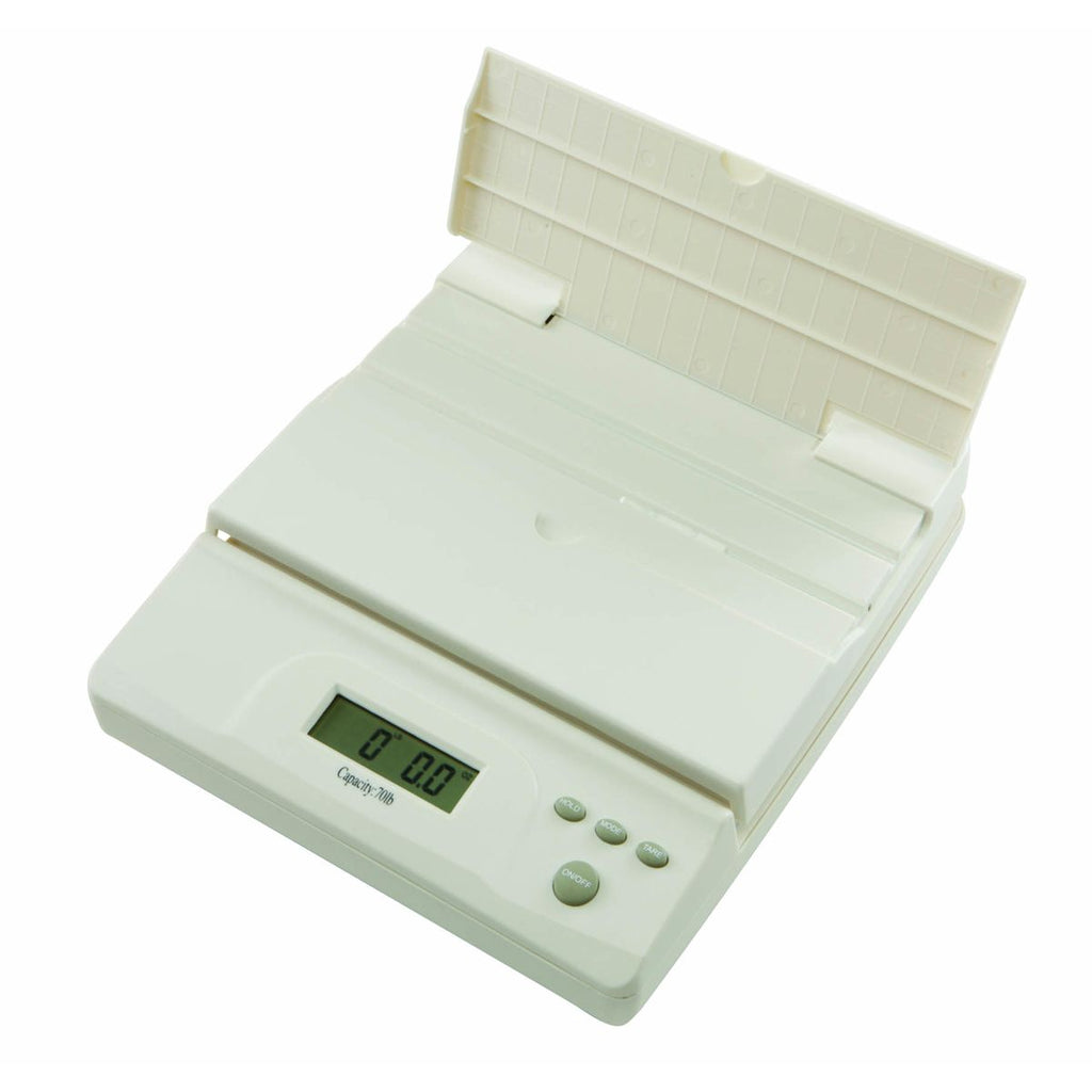 This dependable digital postal scale measures items up to 70 lbs. (32 kg) and has a tare setting to calculate the net weight of items in containers. The digital scale automatically shuts off after 90 seconds of non-use, and the top flips up to hold your item in place if needed.