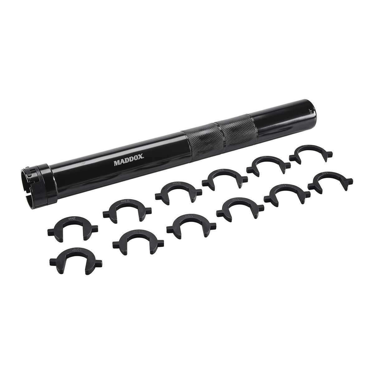 This MADDOX™ Inner Tie Rod Tool Set makes it easy to replace inner tie rods without removing the rack and pinion. The inner tie rod removal kit includes seven SAE and metric adapters to handle a variety of vehicle makes and models. The set is constructed from forged steel and is organized in a custom case for easy storage and transportation.