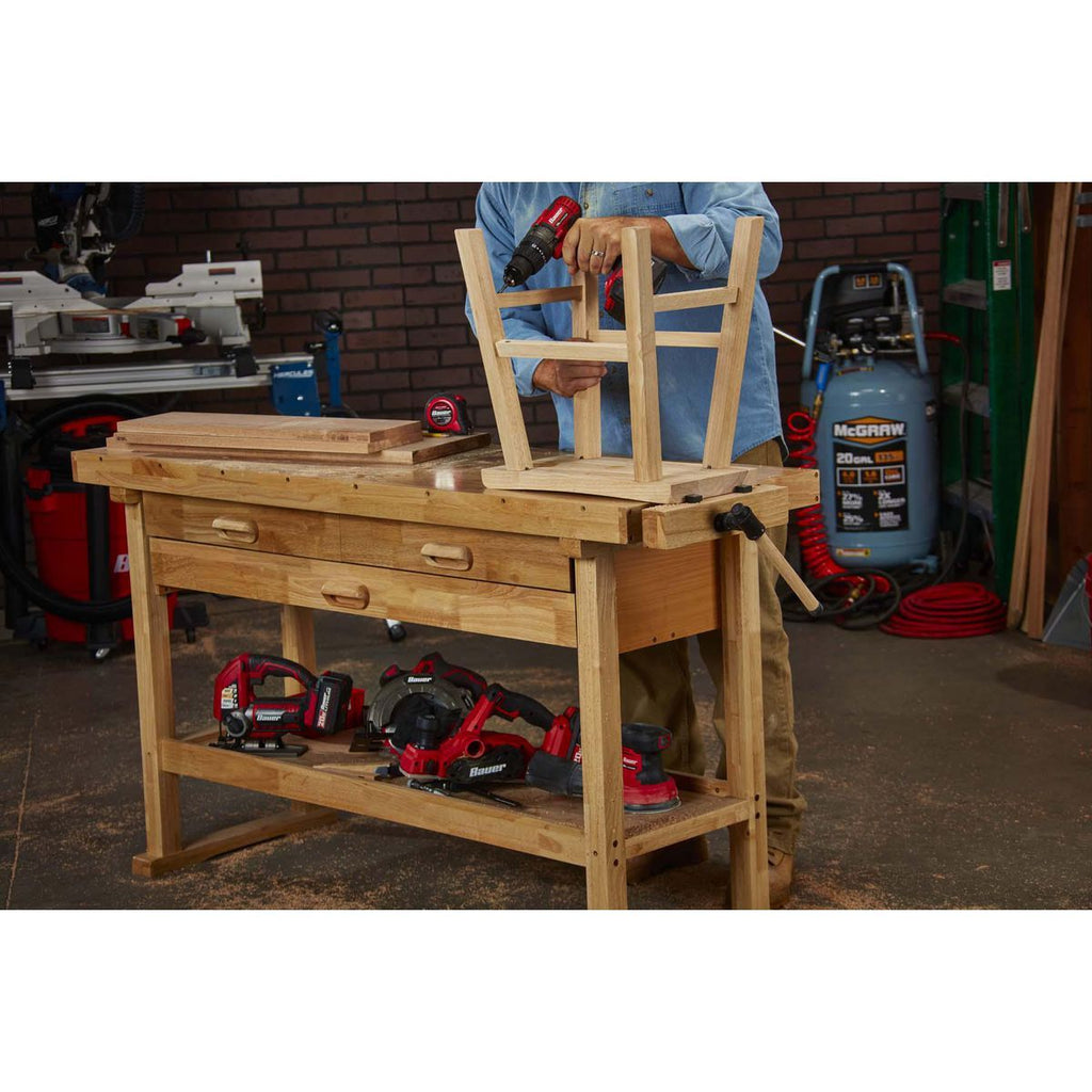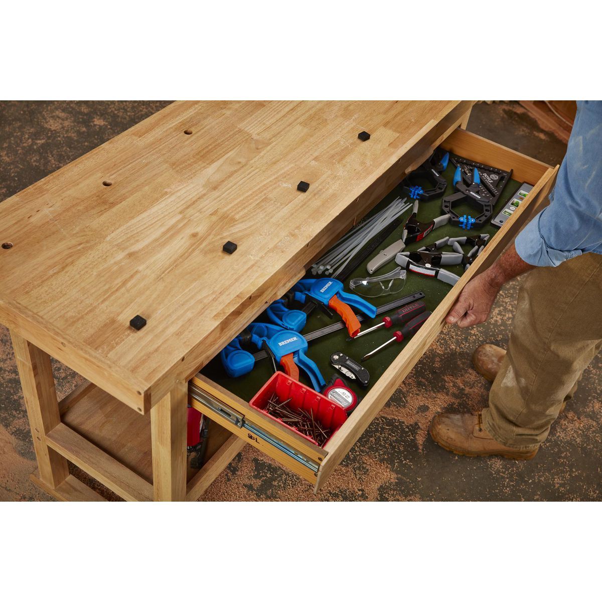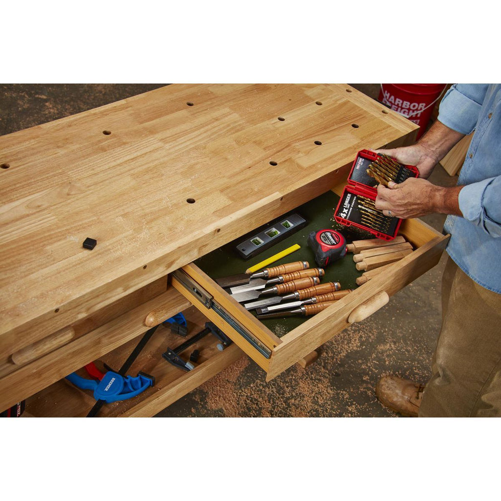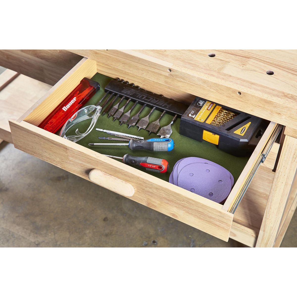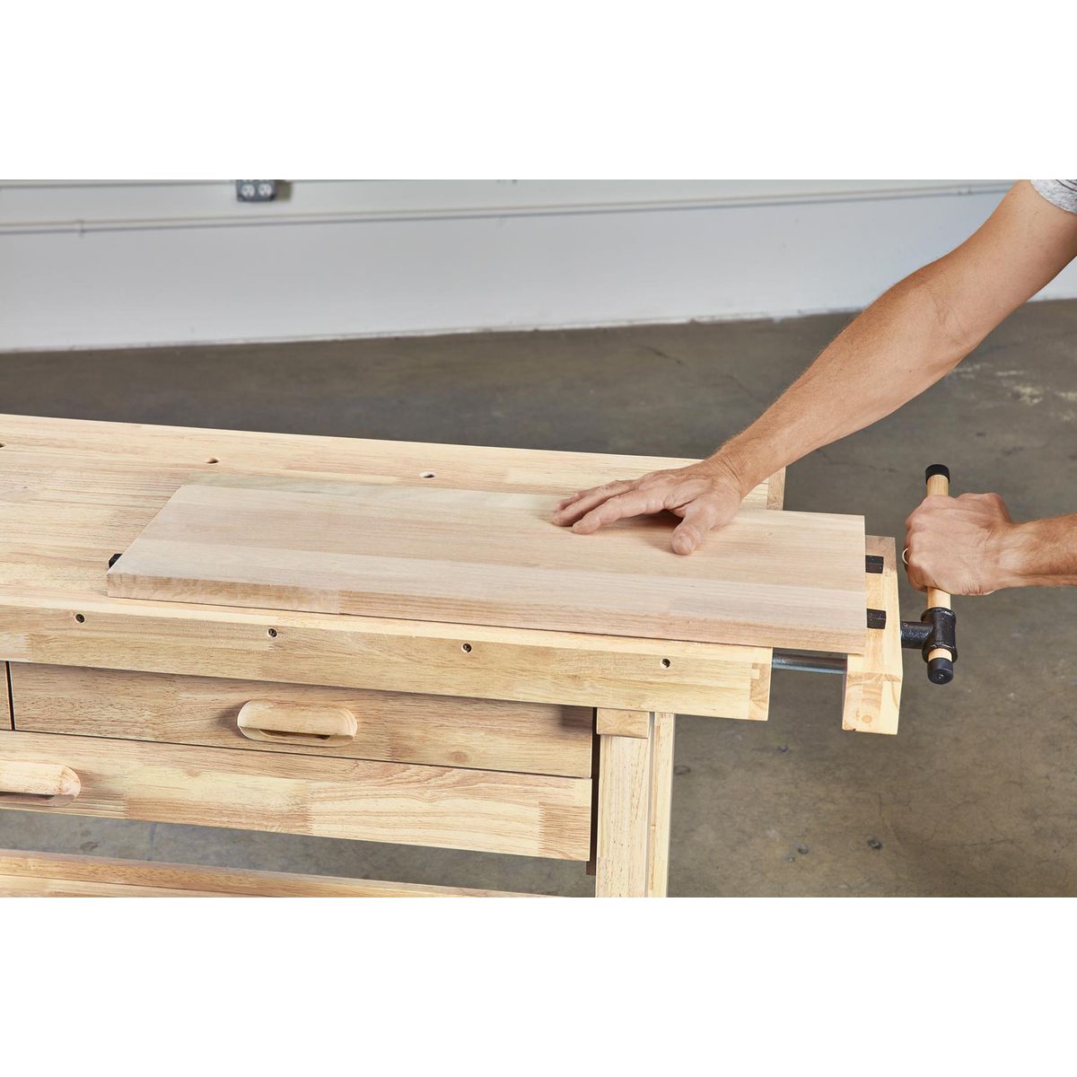 The YUKON™ 60" 3-Drawer Hardwood Workbench offers over 1,200 sq. in. of workspace for a wide variety of woodworking projects. This workbench has a hardwood top with 4 anvil pegs and 4 wooden pegs for securing workpieces. The 7 in. wood block vise holds workpieces without scratching them. Three felt-lined drawers, including one full-width, make it easy to store and organize tools and hardware.