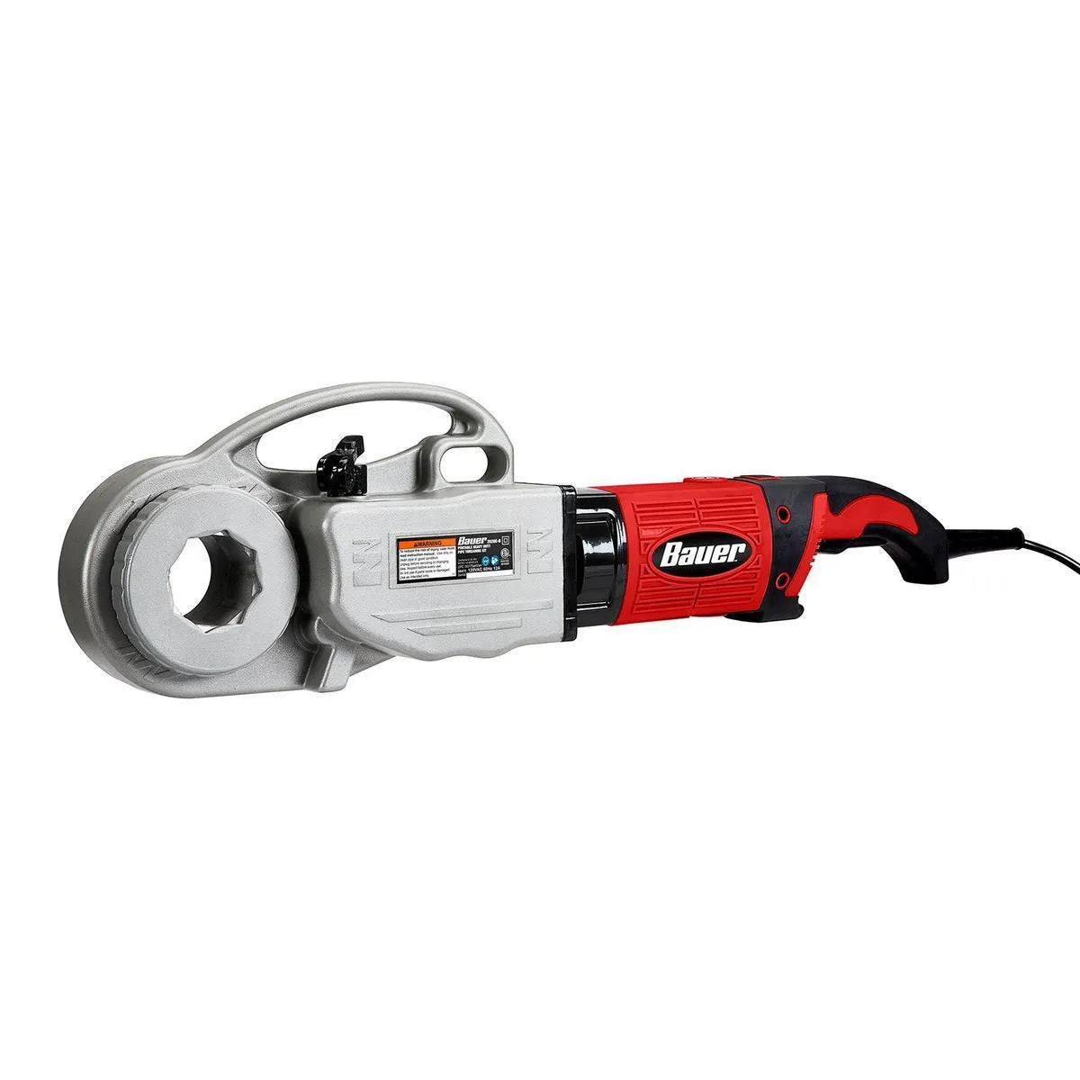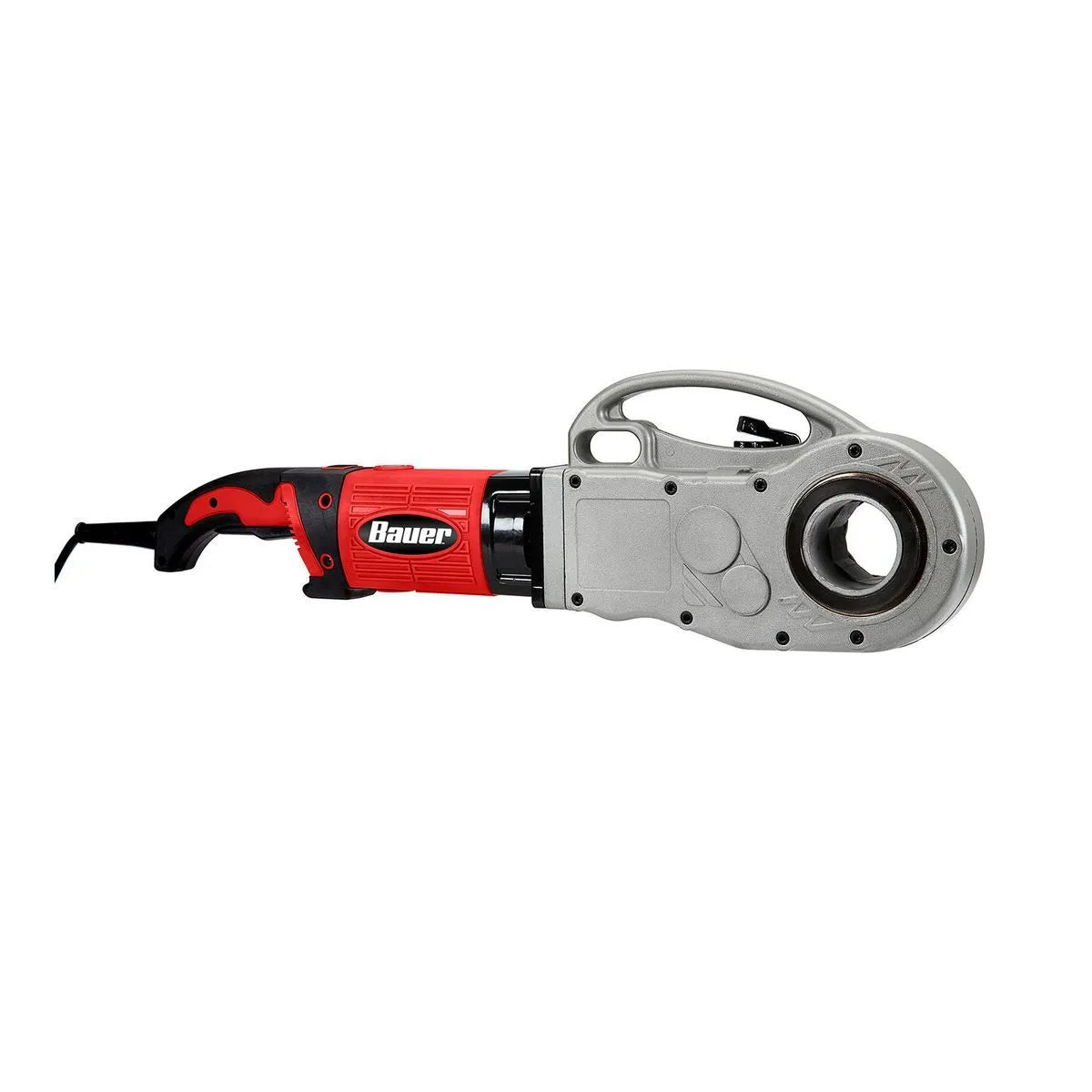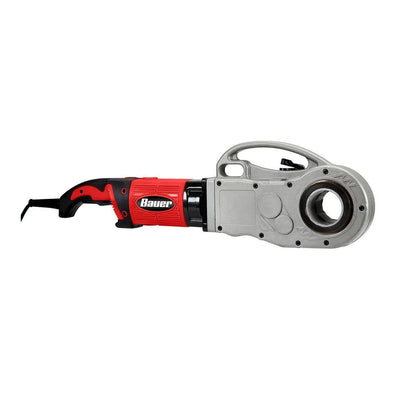 The rugged BAUER™ handheld electric threader threads 1/2" to 2" pipes 40% faster*, saving you time and effort. Designed for jobsite use, its durable die-cast aluminum housing withstands the toughest working conditions. The ergonomic soft-grip handle provides all-day comfort. Includes a complete set of 6 dies.