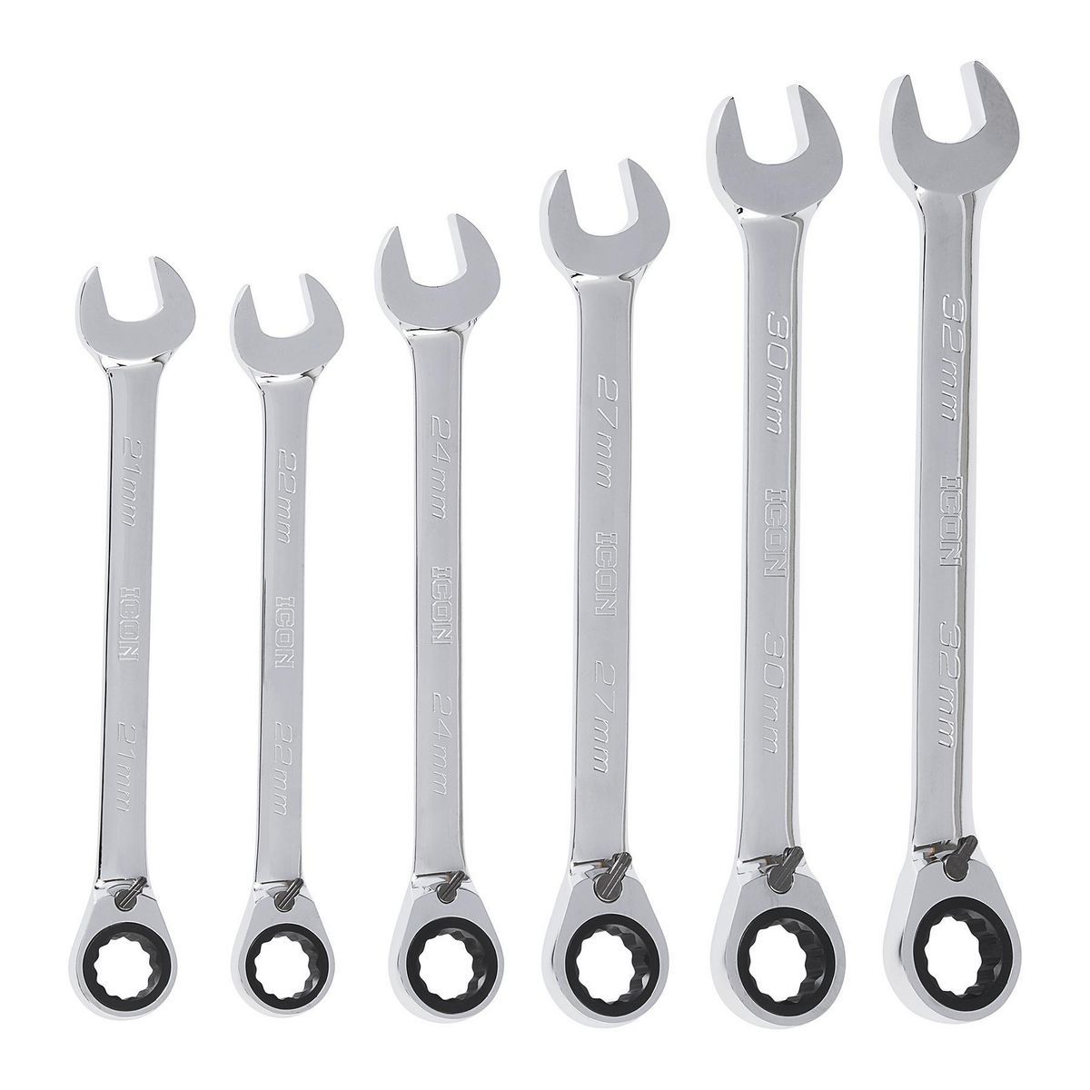 The ICON® Professional Large Reversible Ratchet Combination Wrench Set features a reversible ratchet mechanism so you don't have to flip the wrench to change direction. The handle design is balanced for a comfortable and secure grip. Like all ICON® hand tools, these combination wrenches are backed by a hassle-free lifetime manufacturer's warranty.