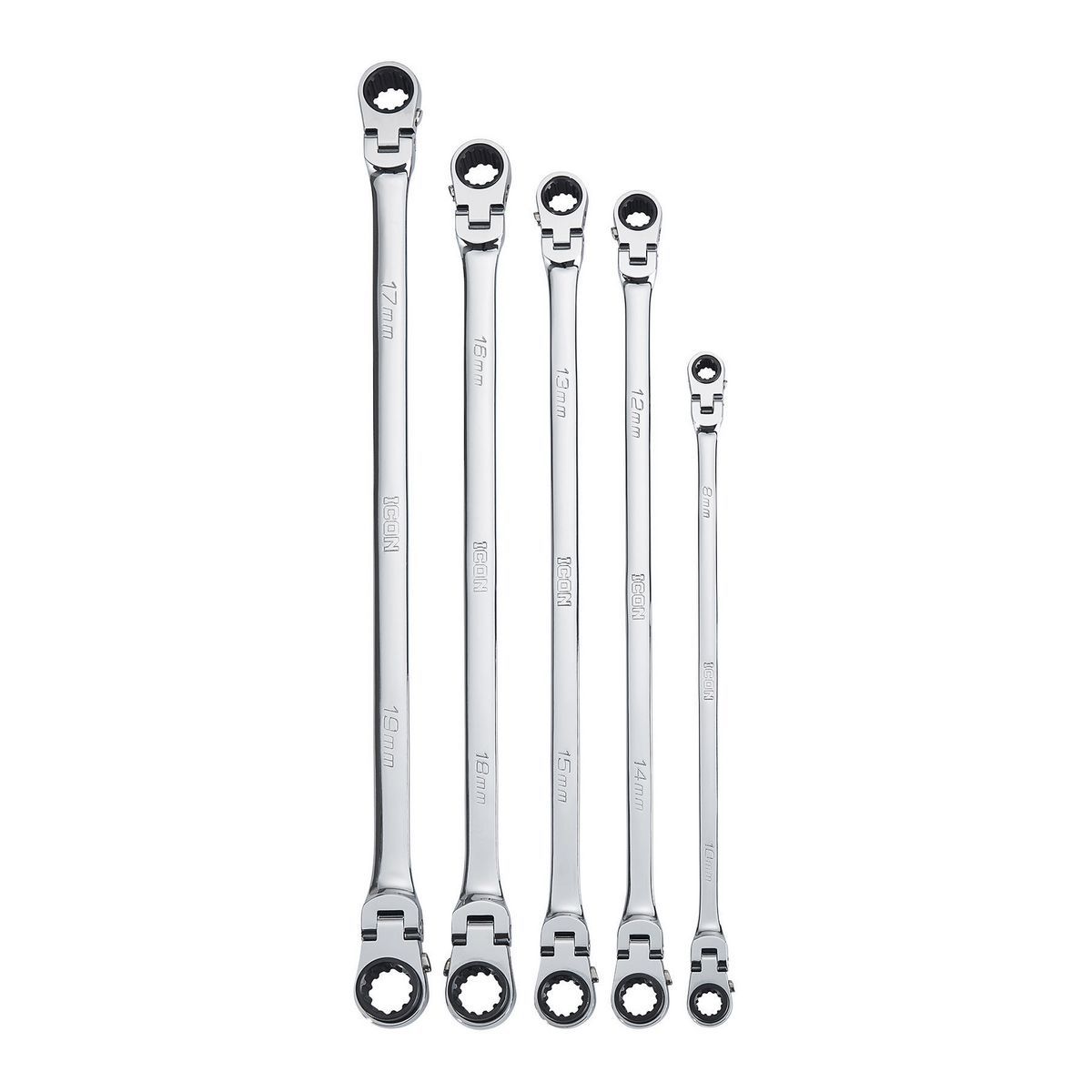 The ICON™ Professional Double Box Flexible Ratcheting Wrench Set is designed for extra reach and maximum torque. Each wrench has a balanced handle design for a comfortable and secure grip. Like all ICON™ hand tools, these ratchets are backed by a no-hassle lifetime manufacturer's warranty.