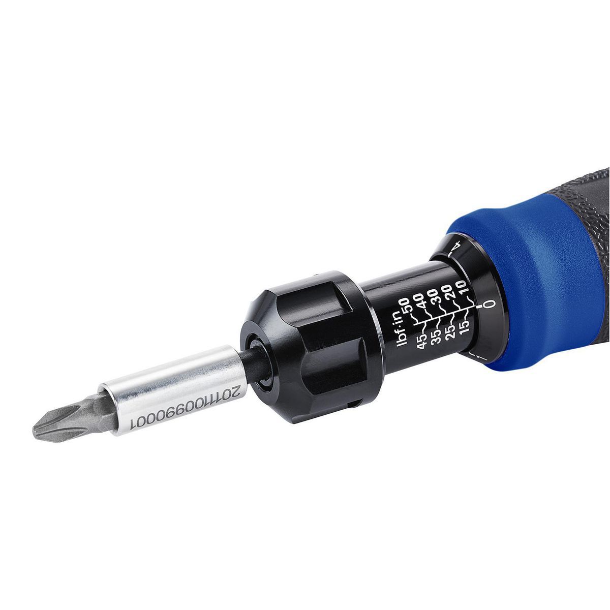 This precision torque screwdriver adjusts in 1 in-lb increments for maximum accuracy. The torque range extends from 10 to 50 in-lbs to accurately tighten small fasteners on equipment. The mechanism is certified accurate to +/- 6%.
