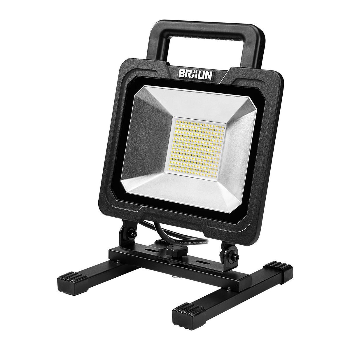 This reliable 12,000 lumen BRAUN™ LED work light stays cooler and lasts longer than halogen lights. The LED has a lifespan of up to 50,000 hours, so you'll never need to change a bulb. This work light features a durable, impact-resistant aluminum housing that stands up to jobsite abuse. The waterproof power switch makes this lamp suitable for indoor and outdoor use.