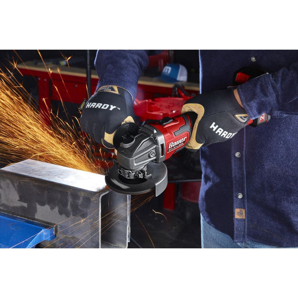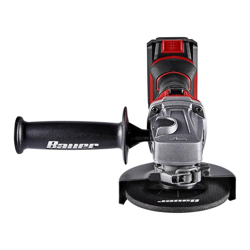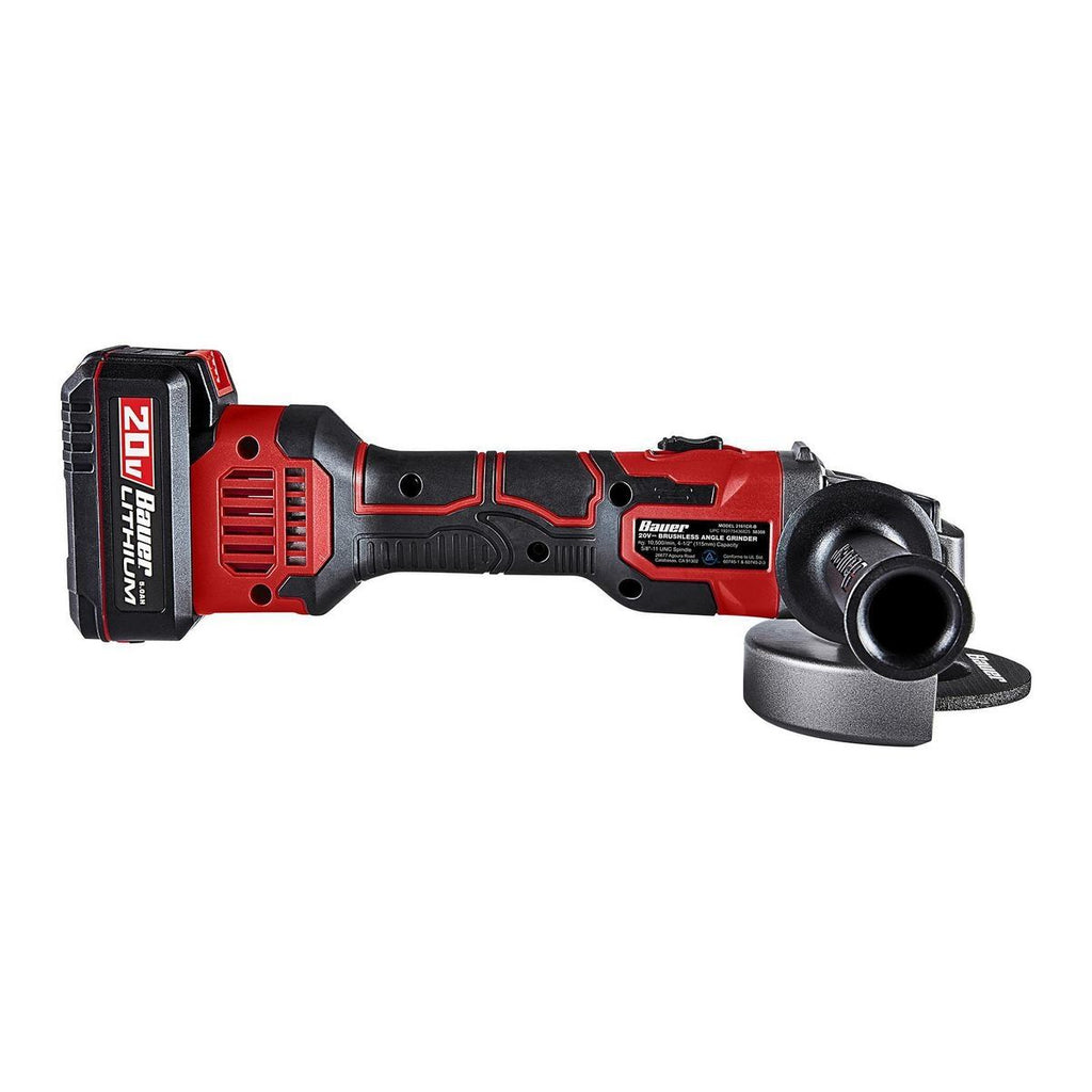 The BAUER™ 20V Brushless Cordless 4-1/2 in. Spindle lock for quick and easy wheel changes. This angle grinder is the ideal choice for metal grinding, shaping and sanding. Powered by the BAUER™ lithium-ion battery system.