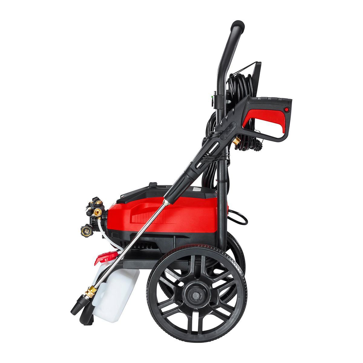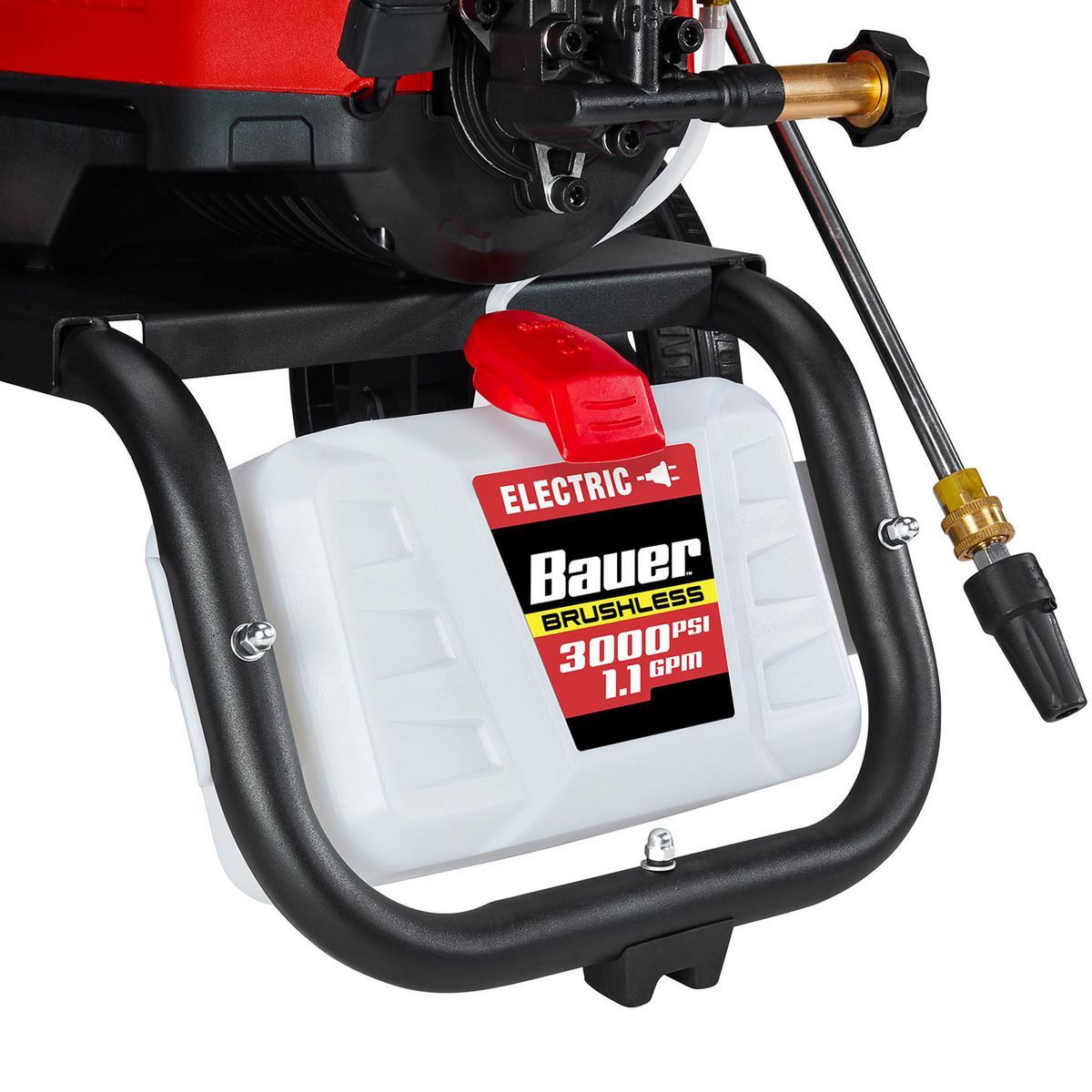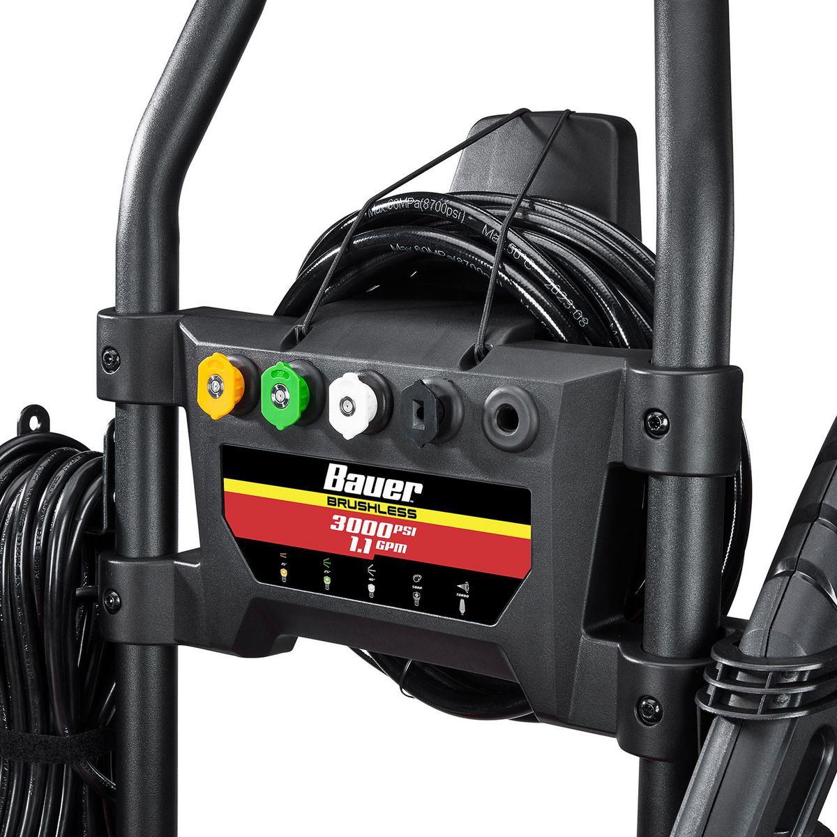 The BAUER™ electric pressure washer features a high-performance brushless motor for 45% more cleaning power*. With a cleaning power of 3,000 PSI, this pressure washer is ideal for stripping wood decks, removing tar, tree sap, and insect stains from cars, as well as tackling tough mold, oil, and rust stains. The turbo nozzle ensures faster cleaning on concrete, brick, and vinyl. Onboard storage allows for convenient accessory storage.