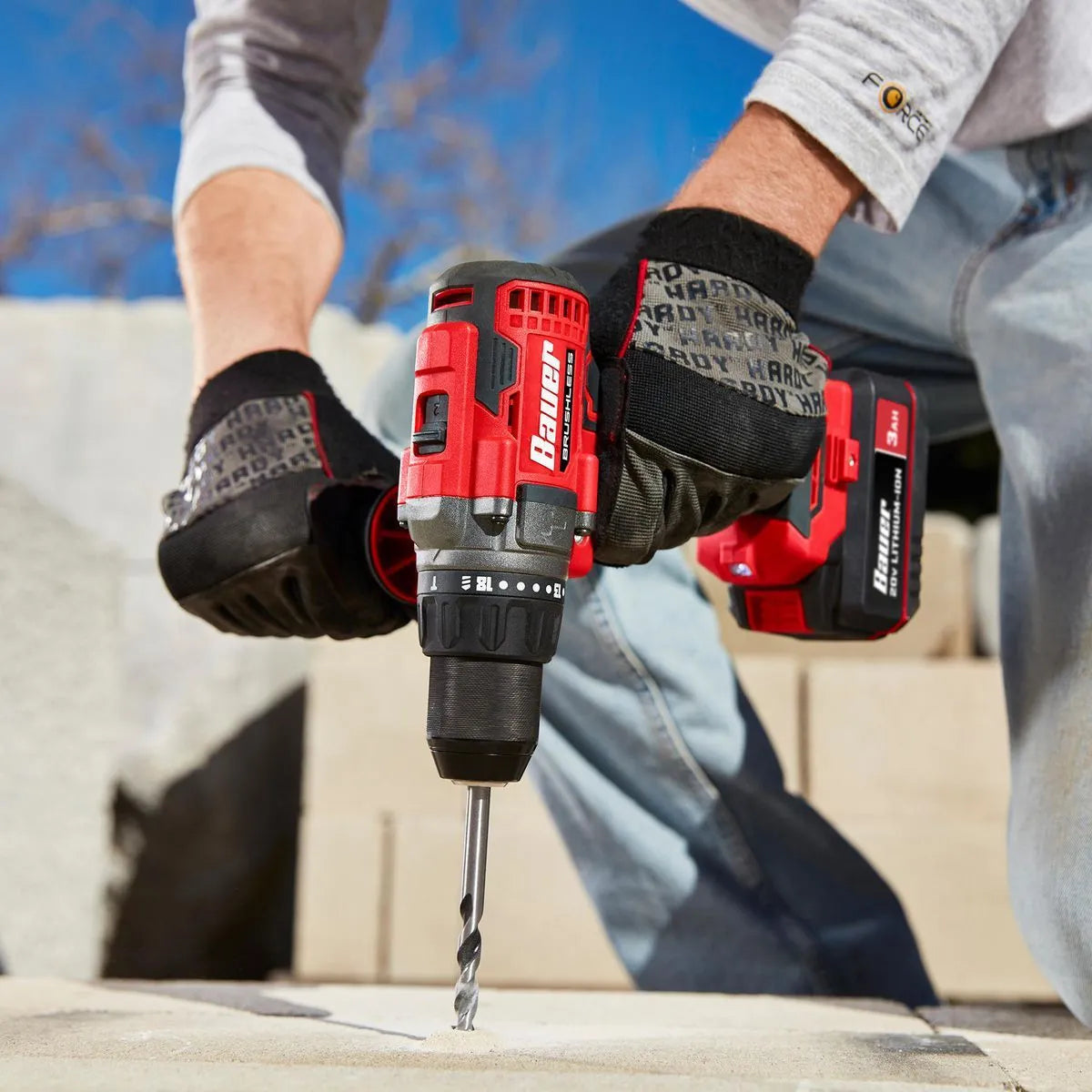 The BAUER™ 20V 1/2" Brushless Cordless Hammer Drill delivers 25% more torque* for drilling into concrete or masonry. It offers a speed of 0-5,800/0-23,000 BPM for reliable power and performance. Its rugged, all-metal construction ensures optimal performance every day. The convenient LED light provides excellent visibility in dark areas.