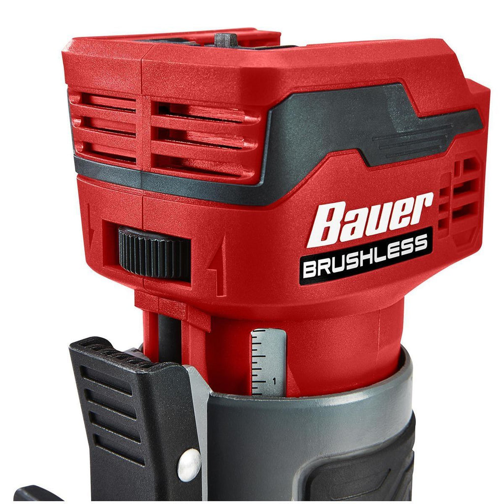 The BAUER™ 20V Cordless Variable Speed Compact Router gives you the features of a corded tool, with the flexibility of cordless. Micro-Adjust depth control is ideal for shaping precision trim, moldings and scrollwork. Soft-start motor control means there's no accidental chipping or gouging. Variable speed dial adjusts bit speed for hard or soft woods. Powered by the BAUER™ battery system, this compact brushless router goes where the job is.
