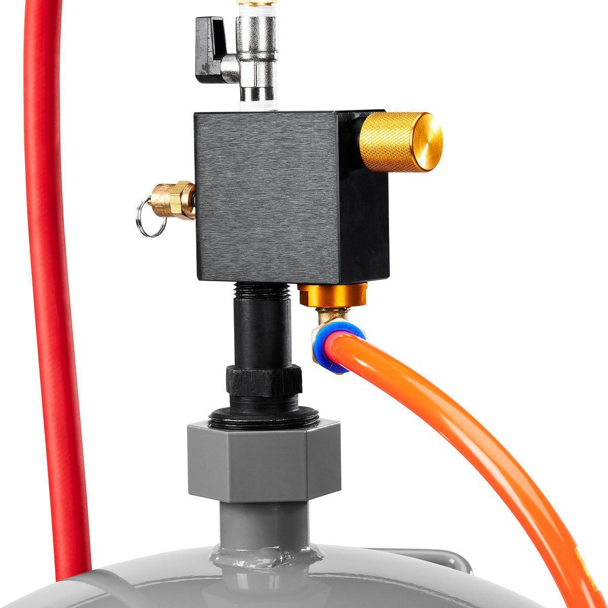 - The water trap removes moisture to prevent clogging.
