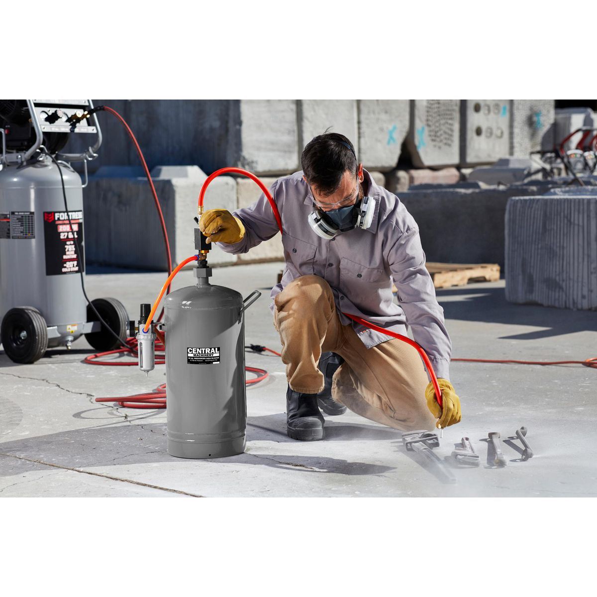 The CENTRAL MACHINERY™ 18 kg pressurized sodium bicarbonate blasting machine uses a safe, dry sodium bicarbonate blasting agent for environmentally friendly, chemical-free surface stripping and preparation. Use this machine to strip paint, remove tough dirt from sheet metal, glass, or chrome, clean delicate parts or soft metals, and work in areas where other blasting agents would be unsafe or could damage surfaces.