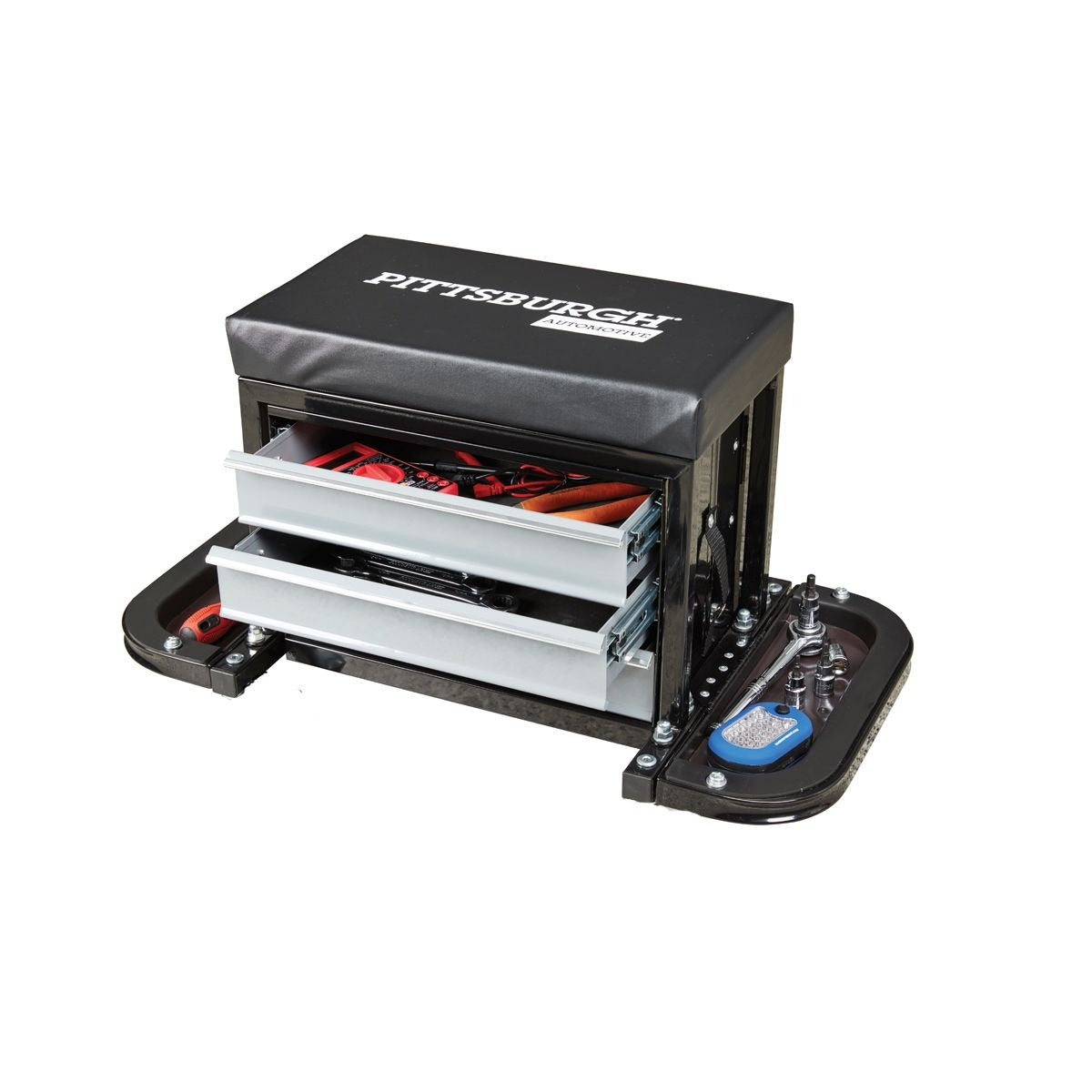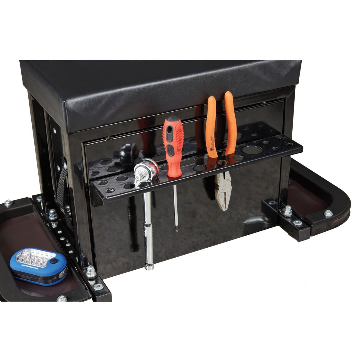 This handy mechanics seat comes with a built-in 3-drawer tool box for accessible tool storage. Keep essential tools and parts close at hand when working on vehicle wheels, brakes and body panels. The seat has 2” of sponge padding for added comfort. The tool holder on the back keeps your most used tools close at hand.