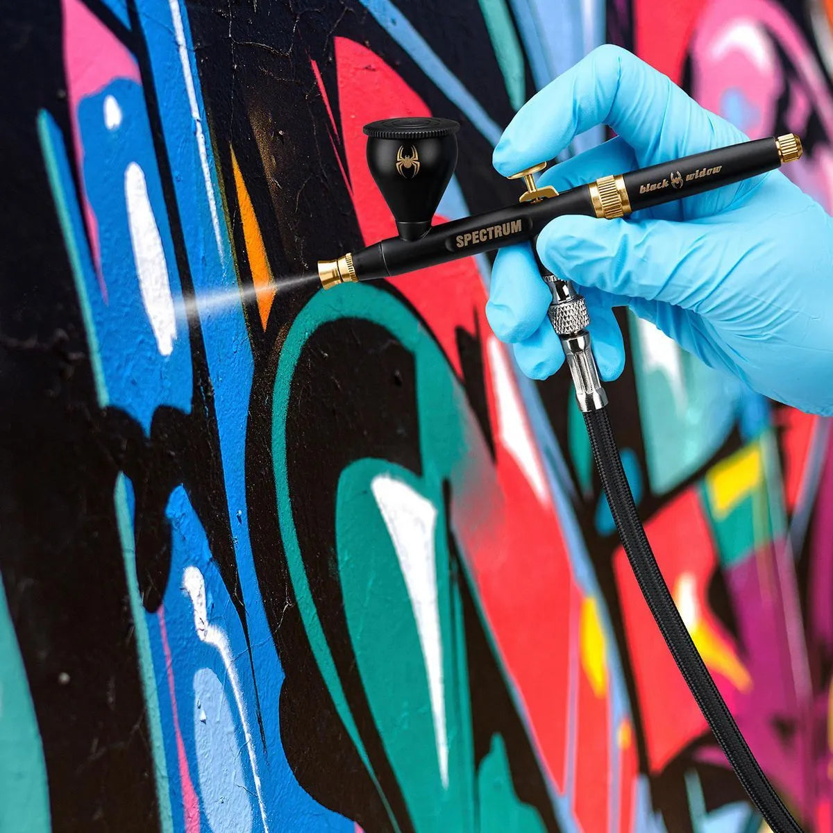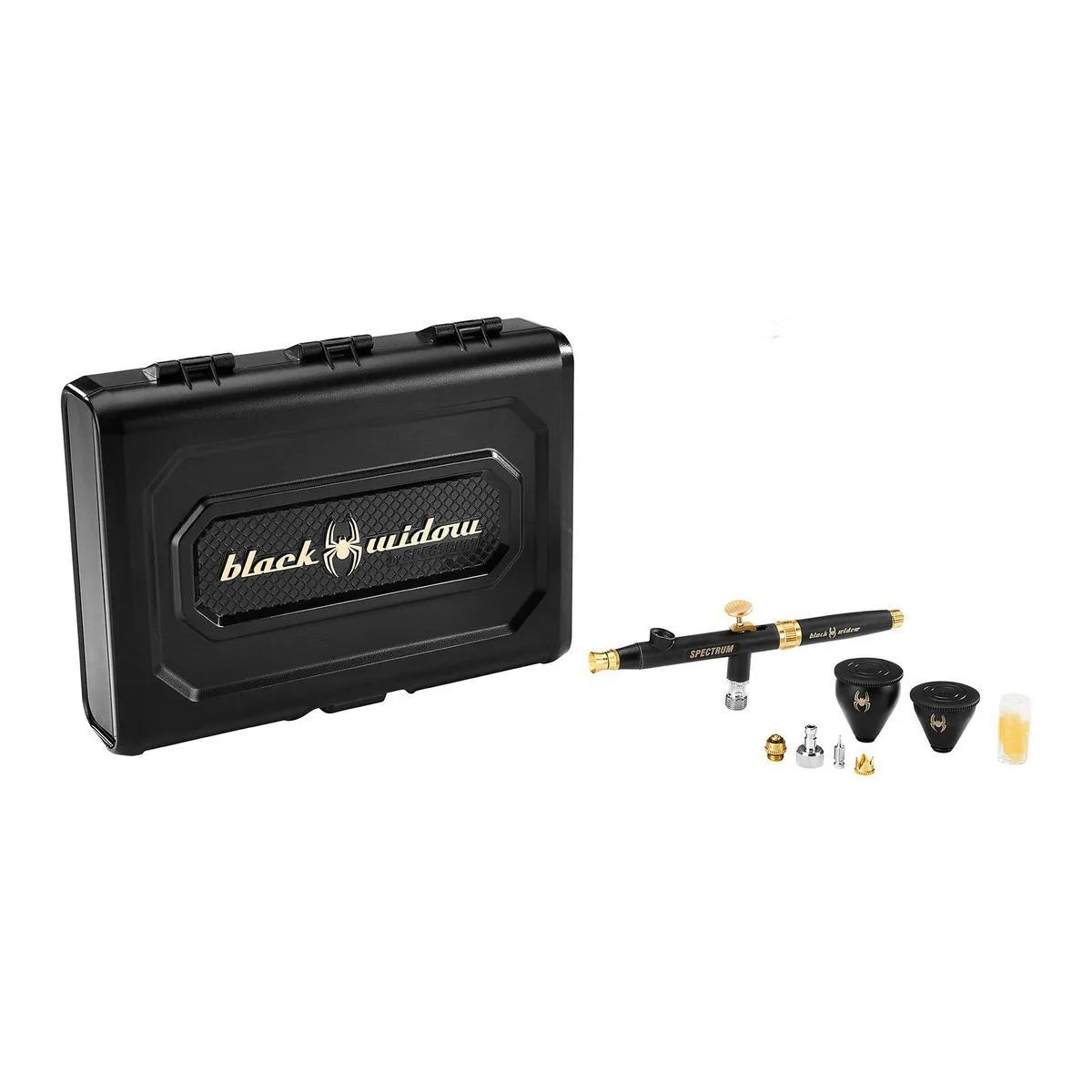 L'aérographe double action à alimentation par gravité BLACK WIDOW BY SPECTRUM™ est doté d'une gâchette de contrôle de la peinture réglable, idéale pour les lignes fines et les traits larges. Il est équipé d'une buse de 0,3 mm pour les lignes fines et d'une buse de 0,5 mm pour un débit de peinture élevé et une couverture importante. Son corps exclusif Quick-Clean facilite le nettoyage et réduit les temps d'arrêt. L'aérographe est livré avec deux types de têtes d'air : une tête ronde pleine pour un usage général et une tête bombée pour les applications de près.