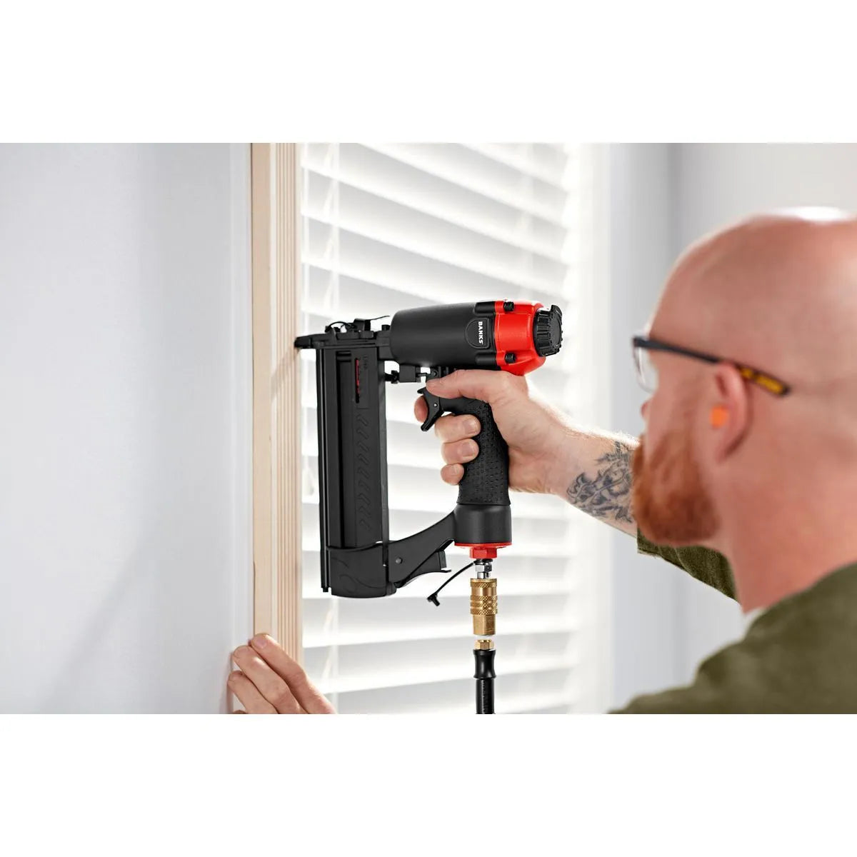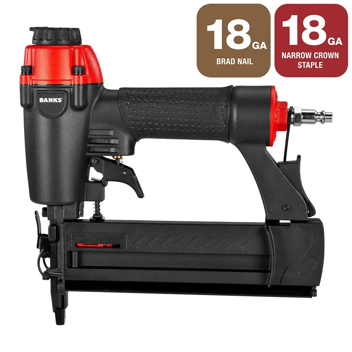 Cette cloueuse de finition et agrafeuse à couronne étroite BANKS® 2 en 1 de calibre 18 est idéale pour enfoncer des clous de finition et des agrafes à couronne étroite. Utilisez la position clou pour fixer tous types de boiseries et moulures. La position agrafeuse est idéale pour la fixation générale de boiseries ou de tissus d'ameublement.
