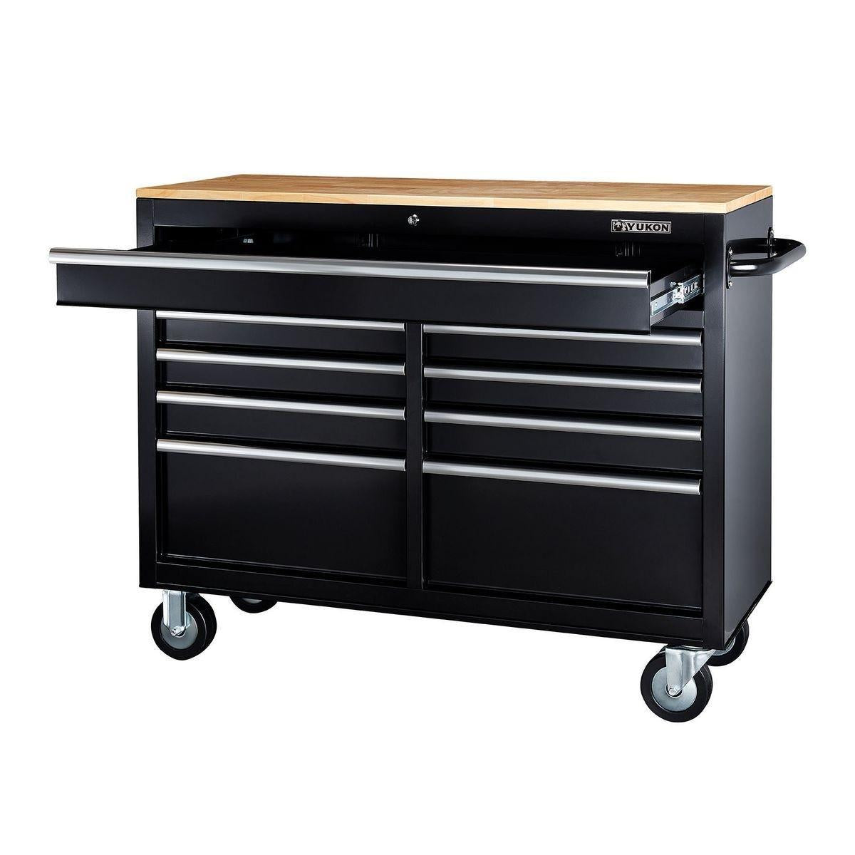 Cette armoire de rangement YUKON® à 9 tiroirs de 46 po est dotée d'une double banque de tiroirs avec glissières à roulement à billes pour une ouverture en douceur. Fabriqué avec de l'acier épais, des glissières de tiroirs robustes et une capacité de charge élevée, ce poste de travail à 9 tiroirs a un dessus en bois massif avec une grande surface. Les tiroirs du bas extra-larges sont idéaux pour le rangement des outils électriques.