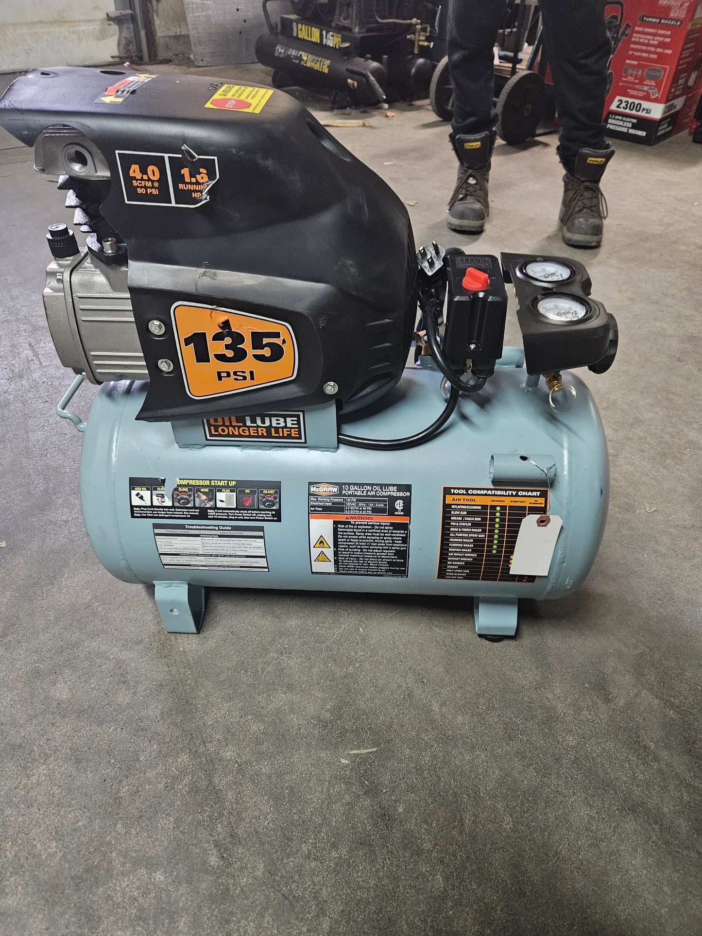 Ce compresseur d'air portable MCGRAW® est idéal pour l'utilisation intermittente d'outils pneumatiques, la peinture, le clouage/agrafage et les soufflettes. Doté d'un puissant moteur de 1,6 HP avec protection contre les surcharges thermiques, d'une poignée et d'un couvercle de console pour une protection supplémentaire, de gros pneus en caoutchouc et d'une poignée ergonomique pour une portabilité en douceur . Ce compresseur d'air est également doté de stabilisateurs de pied en caoutchouc pour réduire les vibrations et d'un robinet de vidange orienté vers l'avant pour une vidange rapide et complète du réservoir.
