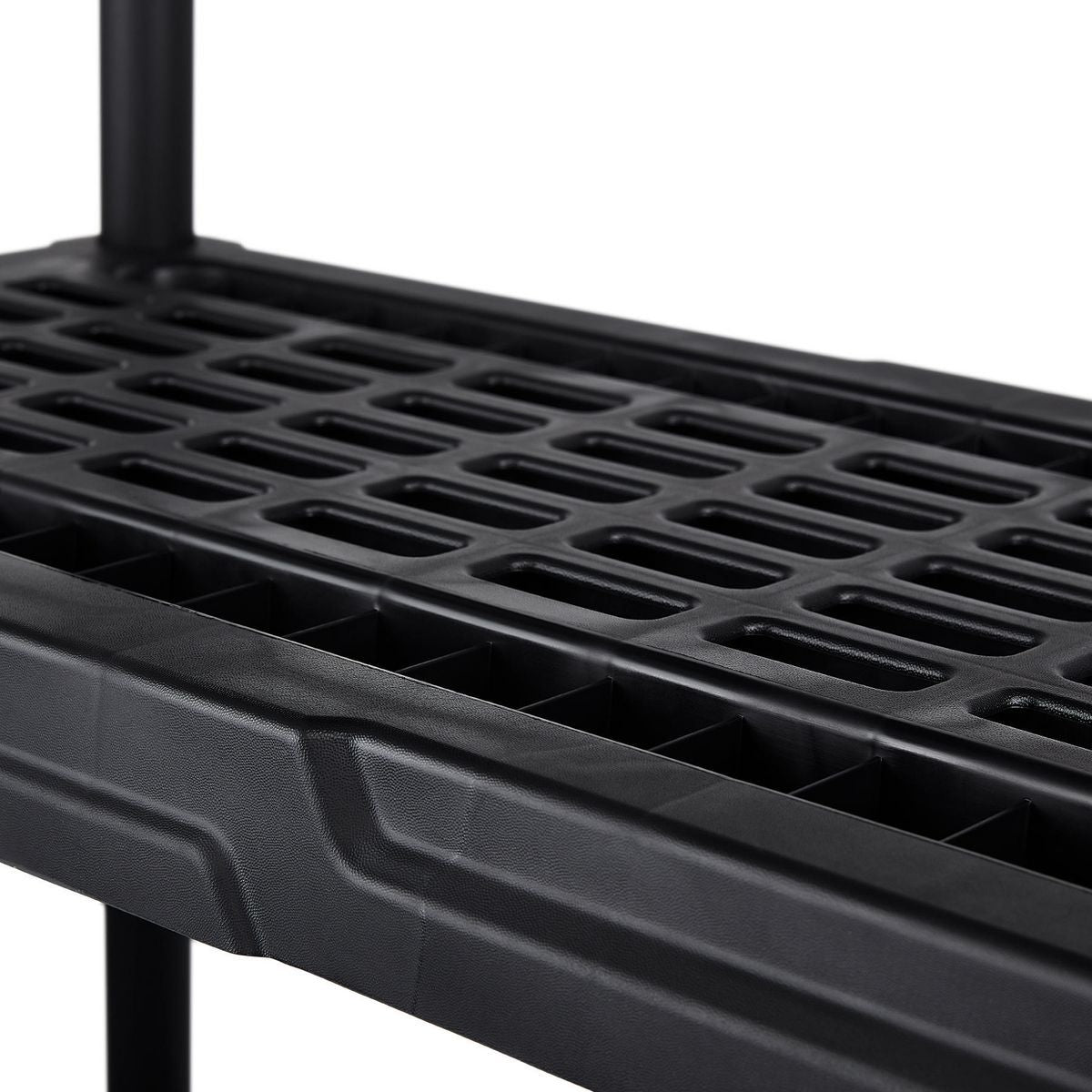 Ce support de stockage à 4 niveaux est conçu pour libérer de l'espace dans n'importe quel magasin ou garage. Fabriqué à partir de polypropylène durable, le support ne se déformera pas, ne rouillera pas et ne pèlera pas. Les étagères sont conçues pour supporter jusqu'à 150 lb chacune.
