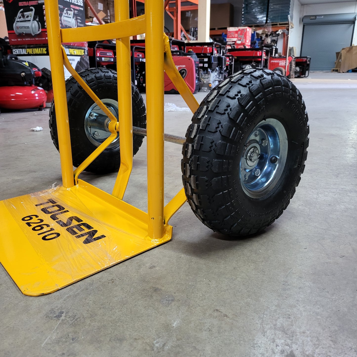 Diable robuste avec poignée en P parfait pour transporter de lourdes charges. Muni de pneus de 10 po (25 cm) en caoutchouc 4 plis pour faciliter les déplacements, pour absorber les vibrations et pour monter les escaliers. Cadre en acier de 550lb de capacité.