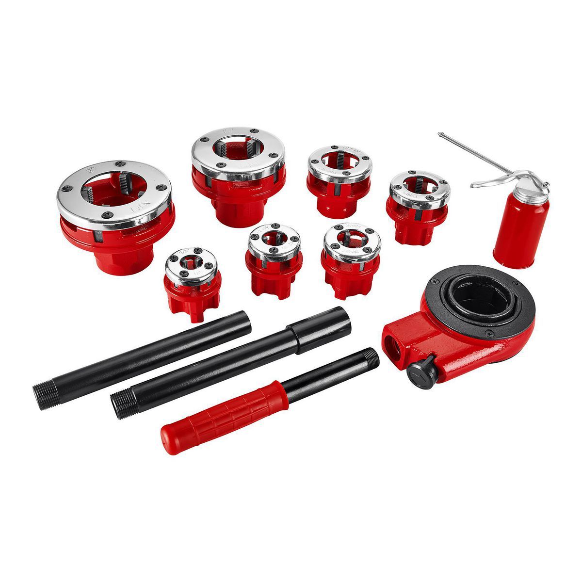 Cet ensemble d'enfile-tuyau à cliquet comprend une tête à cliquet robuste, une poignée extra-longue de 28 po, 7 têtes de filière en acier, un bidon d'huile et une mallette de transport moulée par soufflage. Les têtes de filière en acier créent des filetages NPT précis sur des tuyaux de 3/8 po à 2 po.