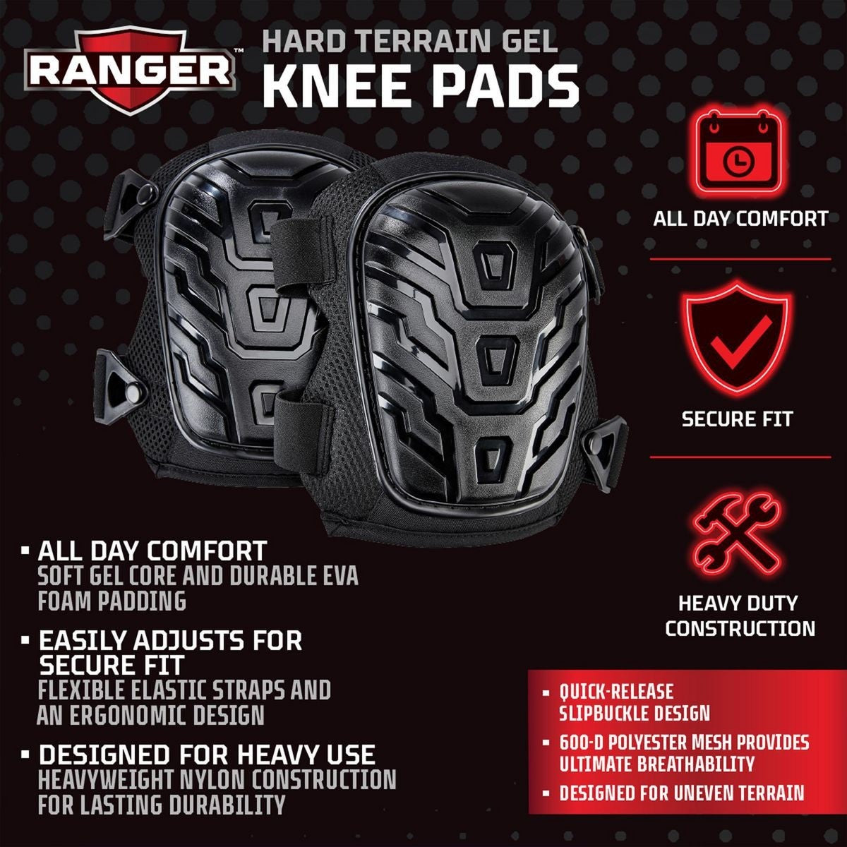 Les genouillères en gel RANGER™ Hard Terrain sont conçues pour un confort et une protection toute la journée sur les terrains accidentés. Les sangles élastiques flexibles et une boucle coulissante à dégagement rapide offrent un ajustement sûr. Fabriqué à partir de nylon épais pour une durabilité à long terme.