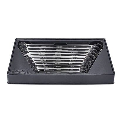 Le jeu de clés mixtes à cliquet professionnelles ICON® est usiné avec précision pour un ajustement optimal aux fixations. Chaque clé est dotée d'un manche équilibré pour une prise en main confortable et sûre. Comme tous les outils manuels ICON®, ces clés à cliquet bénéficient d'une garantie fabricant à vie sans souci.