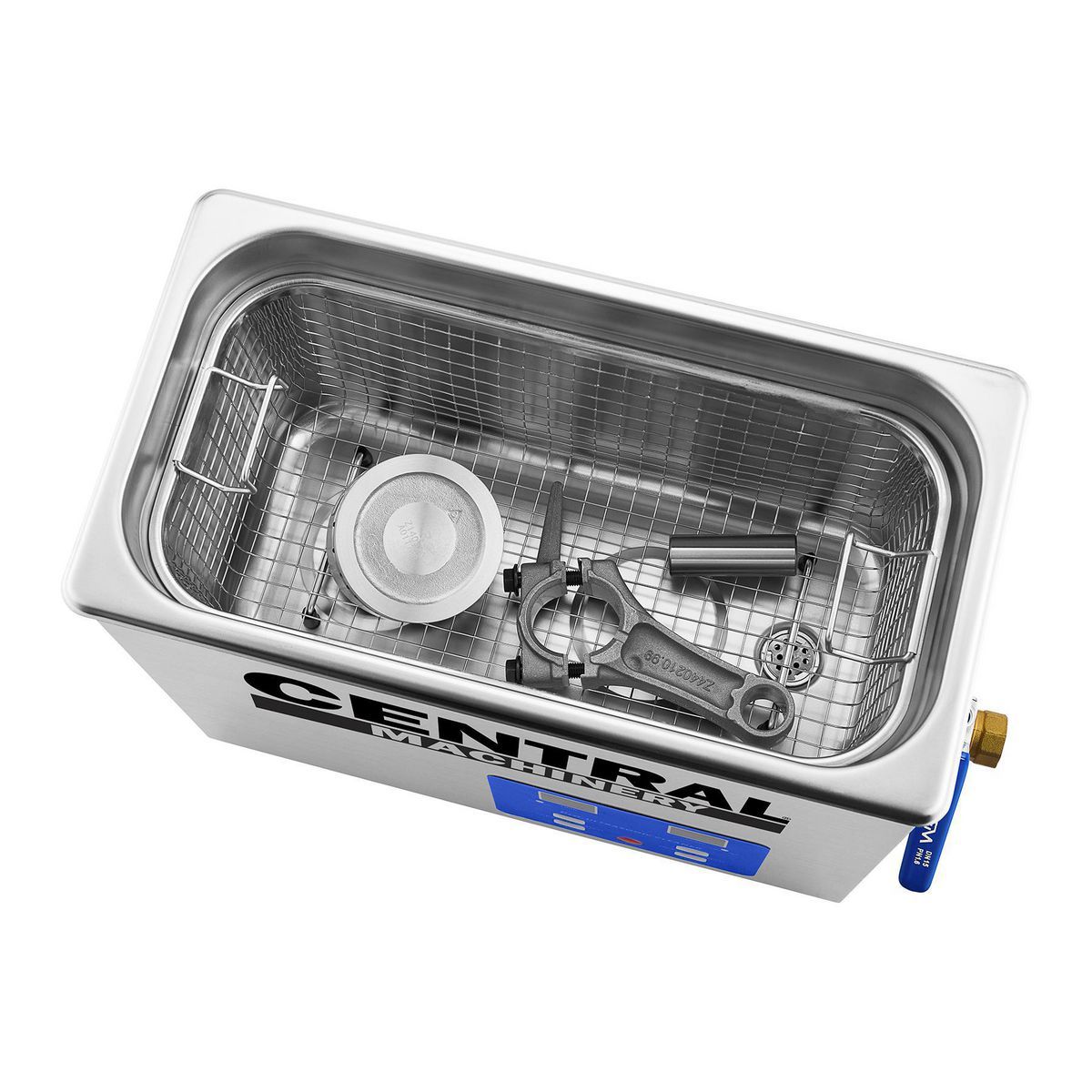 Le nettoyeur de pièces à ultrasons CENTRAL MACHINERY™ de 6 litres possède un réservoir de taille généreuse pour nettoyer les carburateurs, les injecteurs de carburant, les engrenages, les roulements et les outils. Le nettoyeur utilise des ondes sonores haute fréquence de 40 KHz pour nettoyer la saleté tenace des surfaces, des fils et des pièces internes. Il est assez doux pour nettoyer les objets délicats tels que les carburateurs, les injecteurs de carburant, la quincaillerie, les bijoux, les petites pièces métalliques et les lunettes.