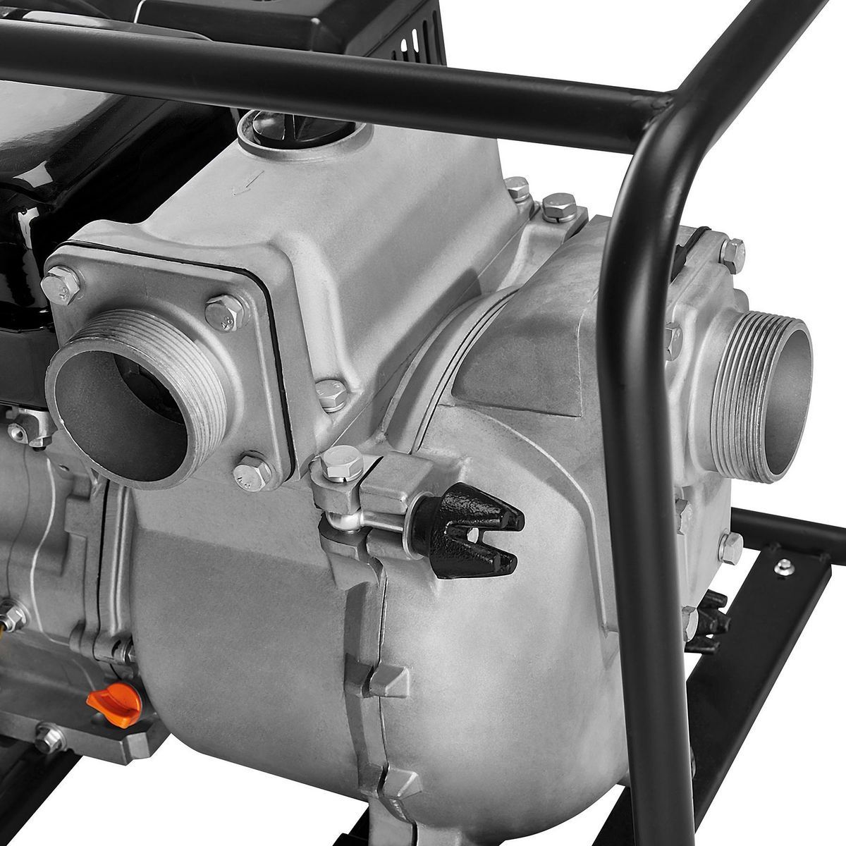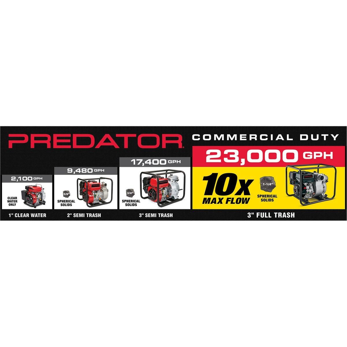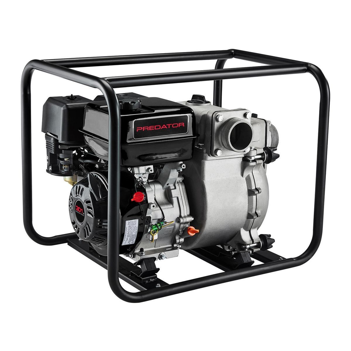 Cette pompe à eau PREDATOR® à moteur à essence à haut débit peut transférer rapidement de l'eau à des volumes allant jusqu'à 23 000 GPH (gallons par heure). Les grands orifices d'admission/d'évacuation de 3 po peuvent laisser passer des solides jusqu'à 1 1/4 po de diamètre. Le puissant moteur à essence à soupapes en tête (OHV) à 4 temps de 301 cc (8HP) rend la pompe idéale pour l'irrigation à grand volume, l'évacuation de l'eau du site d'excavation, le nettoyage d'urgence et d'autres travaux d'évacuation d'eau impliquant de l'eau avec des sédiments. Une volute et une roue en fonte durables combinées à des joints en carbure de silicium de haute qualité garantissent une longue durée de vie de la pompe.