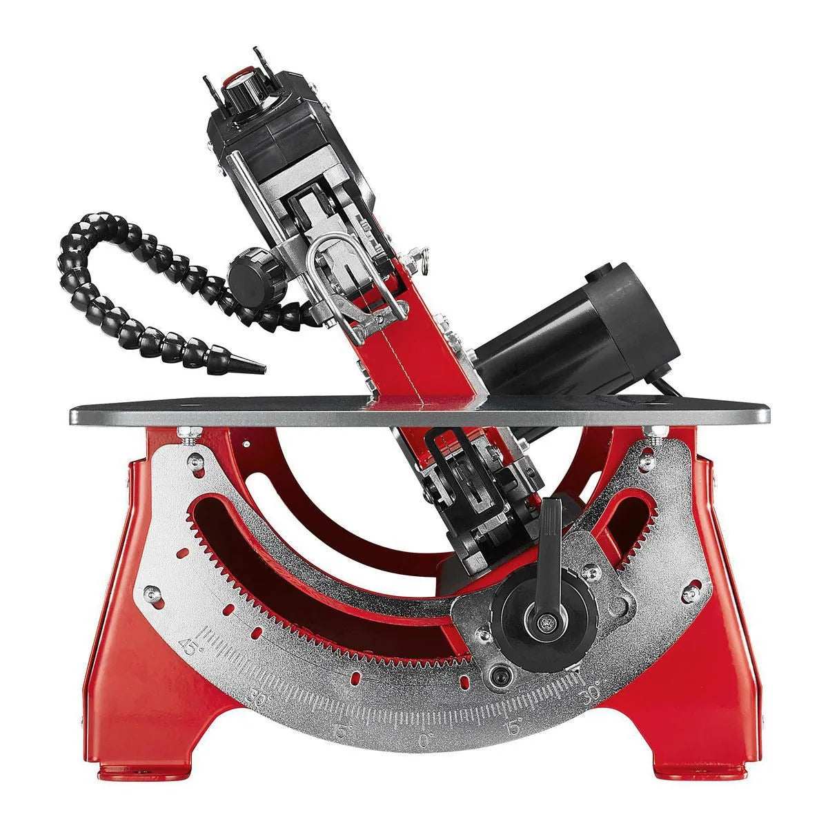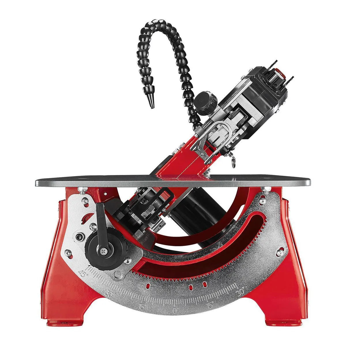 - Le bras s'incline à 30° à gauche et à 45° à droite, maintenant la table de travail à plat pour des coupes précises.