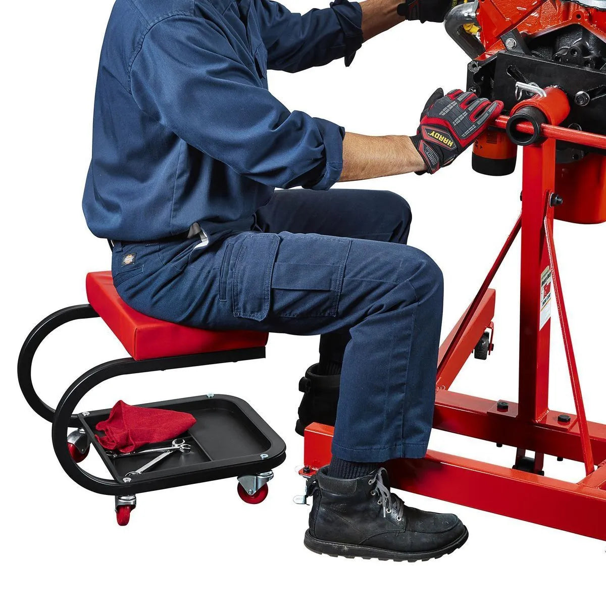 Ce siège roulant pour mécanicien est doté d'une assise extra-large en mousse de 35,5 cm x 25,5 cm x 5 cm d'épaisseur, avec un noyau en contreplaqué. Son cadre en acier robuste supporte jusqu'à 113 kg. Ses roulettes pivotantes de 6,3 cm de diamètre, résistantes aux chocs, permettent un déplacement aisé sur la plupart des sols d'atelier.