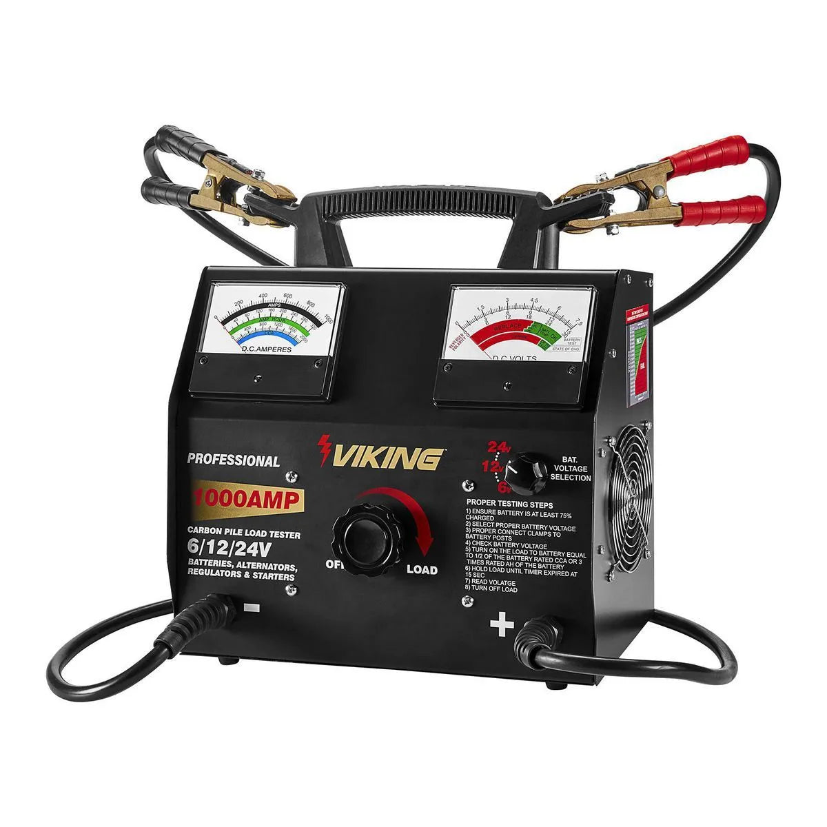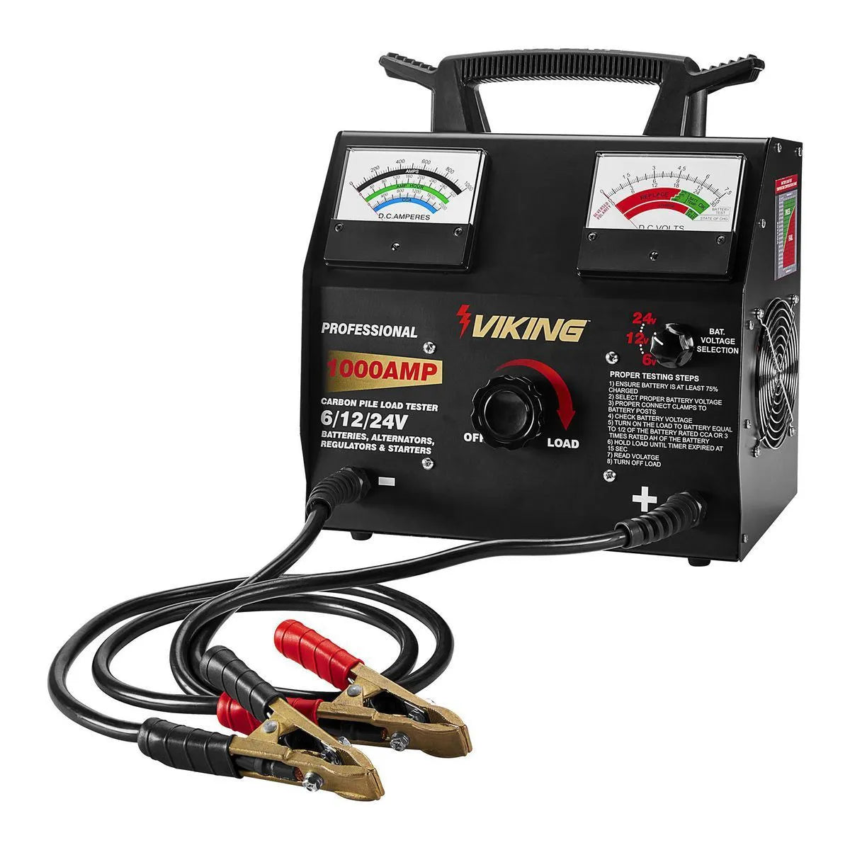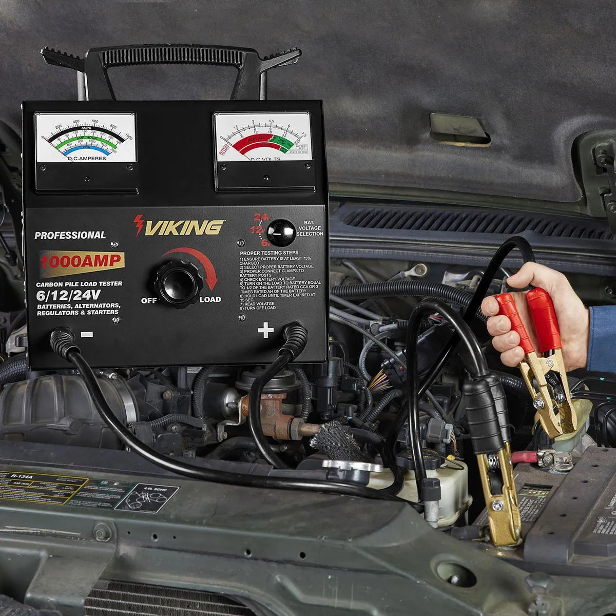 Le testeur de charge VIKING™ 1000 A CC, 6/12/24 V à piles de carbone est capable de tester la charge des batteries automobiles haute performance jusqu'à 2000 ampères de démarrage à froid. Ce testeur professionnel effectue une gamme complète de tests de batterie et de système de charge, notamment la capacité de la batterie, la puissance de l'alternateur, la régulation de tension et la capacité de charge. Grâce à des commandes de charge précises, il peut mesurer des paramètres spécifiques tels que les ampères-heures, ainsi que l'intensité de démarrage standard.